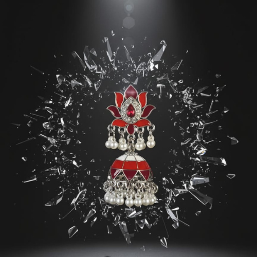 Each piece features a delicately crafted lotus-shaped stud with shimmering crystal accents, followed by a dome-shaped jhumka adorned with enamel work and playful danglers. Available in bold red with pearl drops, classic black with beads, and a colorful multitone option, these earrings are a statement of elegance and cultural charm.